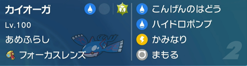 通常カイオーガは単体水技に命中不安のハイドロポンプを使う必要がありますが、フォーカスレンズの効果によって命中を1.2倍することで、ザマゼンタのワイドガードを無視して通せる単体水技として機能します。