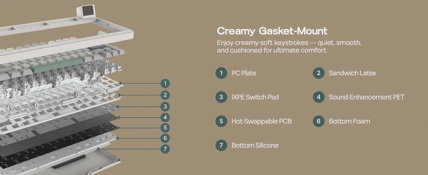 - ガスケットマウントの多重構造による安定感、心地よい打鍵感