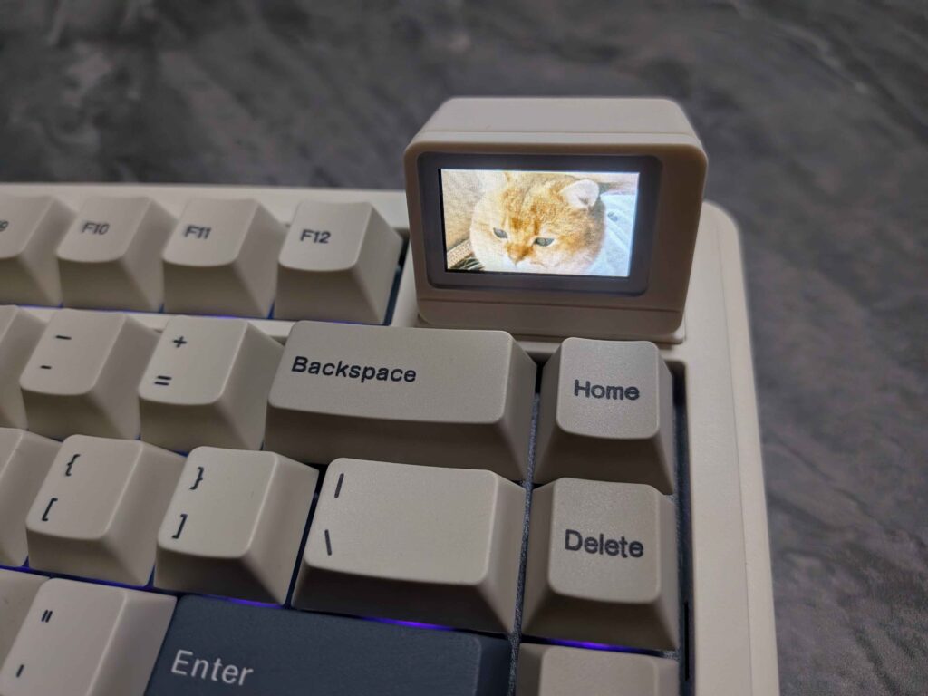 完全に遊び心枠。GIFアニメがループ表示され、専用サイト(https://image.rdmctmzt.com/)からオリジナルアニメを設定することもできます。キーボード上でペットを飼ってるみたいな気分になれます。デフォルトの猫がかわいい。