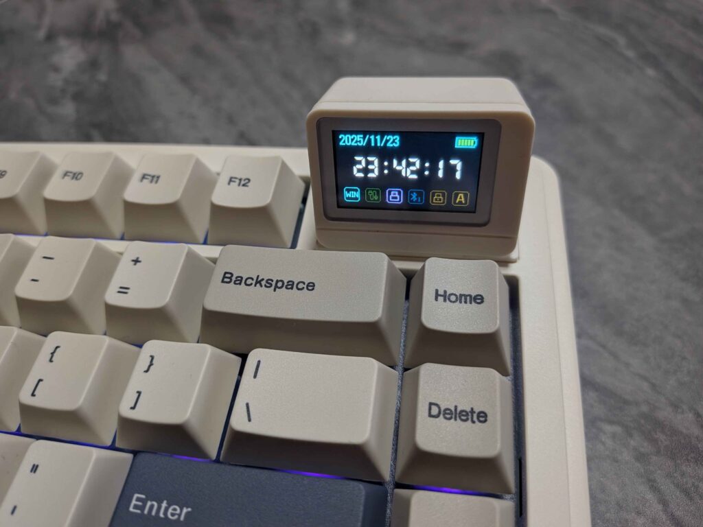 日付、時刻、接続方式、バッテリー残量などを常に表示。特にバッテリー残量が視覚化されるのは非常に便利です。個人的に、この手の製品はこれまで有線で使用してきたのですが、その理由はバッテリー残量を目視で確認できないのが面倒だったからです。ですがこのキーボードはバッテリー残量の視覚化のおかげでストレスが無く、快適にワイヤレスで使用出来ています。