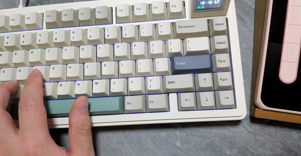 ガスケットマウント構造で音は過度に響かず、でも静かすぎないバランス。静かなオフィスでは気をつけた方がいいですが、自宅作業なら快適です。