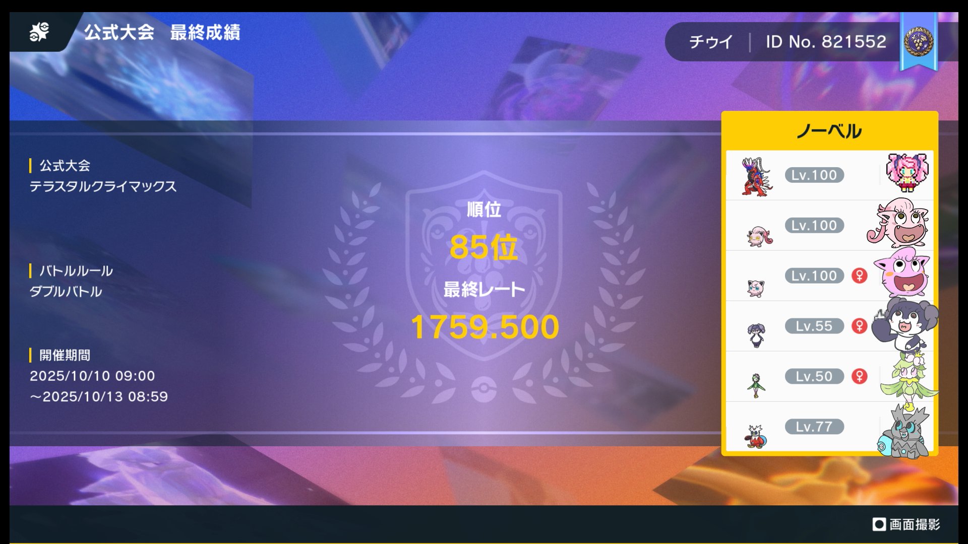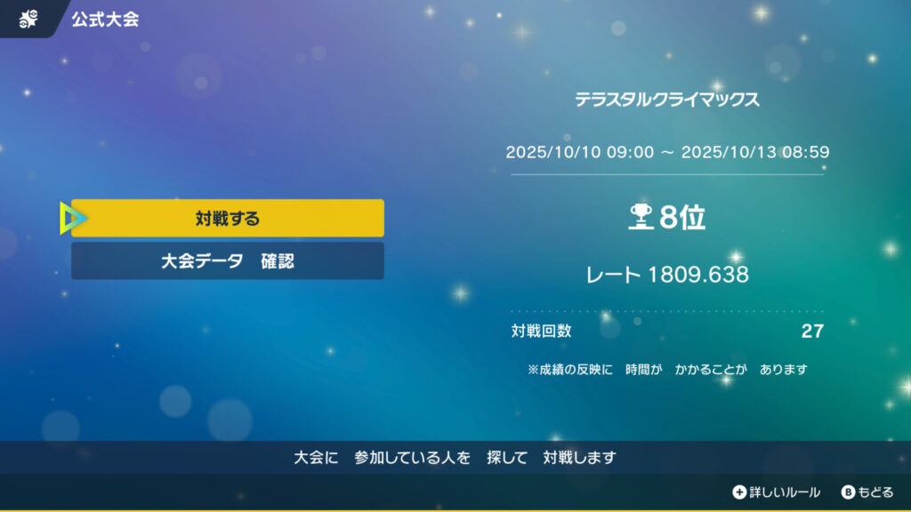 今回はSVの公式大会「テラスタルクライマックス」で24勝3敗(勝率88.9%)レート1809最終23位を達成したコライドン構築の紹介と、その大会考察の記事になります!