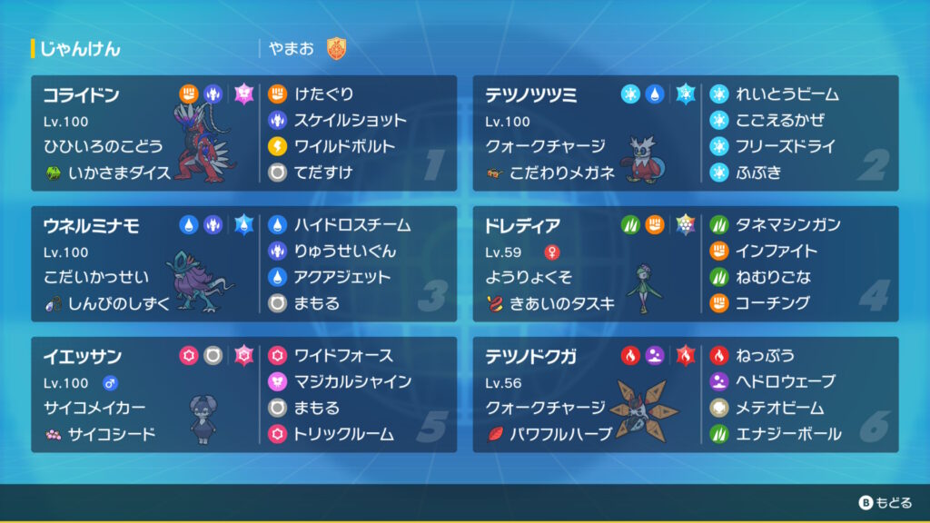でも特定の並びの無理な型を引いた時に50%でぶっ壊せる技を仕込むのは強いし、カバに勝つ為だけにコライドンの汎用性を落とすのは間違いだと思っているので、結果的にこの判断は正しかったと思います。